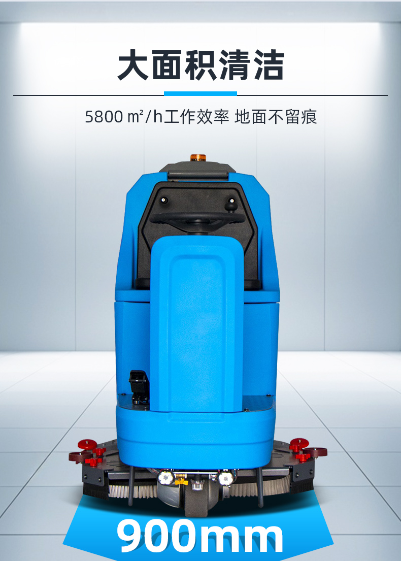 莱特工业洗地机T900型:机身尺寸:1600*1100*1420mm,吸水扒宽度:1200mm,工作效率:6800m²/h,工作宽度:900mm,刷盘转速:190rpm,刷盘功率:600W*2,吸水功率:600W,行走功率:1000W,行走速度:0-7km/h,最大爬坡率:≤25°,额定电压:DC24V,标配电池容量:200Ah锂电池,连续工作时间:5-6h,清水箱容量:175L,污水箱容量:180L,声级:60dB(A),转弯半径:500mm,整车重量:400kg。具备:全自动升高和降低刷盘、吸水扒;刷盘和吸水趴倒车自动升降,有效保护设备损伤;污水箱满了自动停机功能;配有高压清洗枪,可以清洗污水箱和吸水趴,方便快捷;按键式操作面板,简单易懂;双集成控制器,带故障自检功能;滤网可防止污水进入真空电机;配有水量显示器,可直观观察水位变化;大功率前驱电机,转弯灵活,操作便利;超静音设计,适用于对声音敏感的环境,如办公场所,疗养院,医院;吸水扒易装卸,遇到障碍物时自动脱落,可保护吸水扒,帮助机器顺利通过;两个注水口设计:大注水口可实现快速注水,小注水口配备3米长加水管适用于距离水源较远的场所;吸水扒易装卸,遇到障碍物时自动脱落,可保护吸水扒,帮助机器顺利通过。